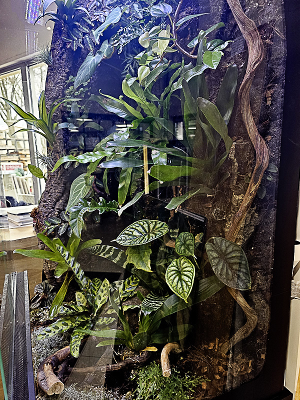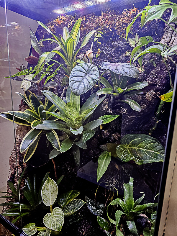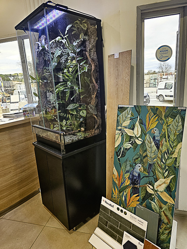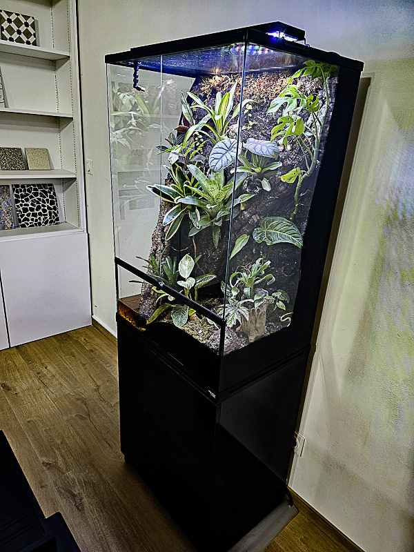 Terrarium sur mesure 60x60x122 cm sur meuble sur mesure. Cascade et brumisation automatisé.
